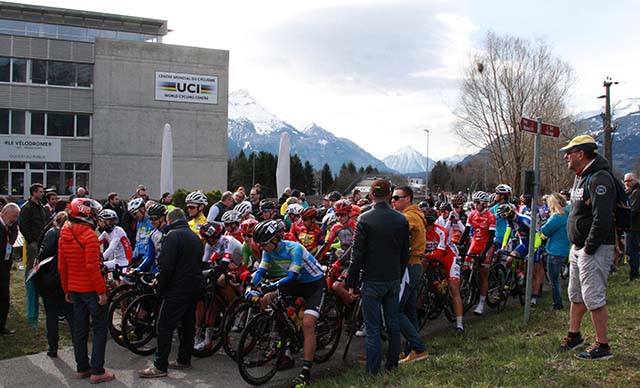 Départ de la 4e et dernière étape depuis le Centre Mondial du Cyclisme à Aigle. 102 coureurs sont encore en course sur les 126 partants lors de la première étape. Au menu, 3 tours de circuit puis montée sur Chavalon. Dénivélation 734 m. Total 70,1 Km. |